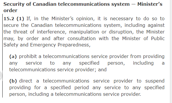 The Act will authorize the Governor in Council and the Minister of Industry to direct telecommunications service providers “to do anything, or refrain from doing anything,” in their opinion what is “necessary” to secure the Canadian telecommunications system, according to the bills summary.